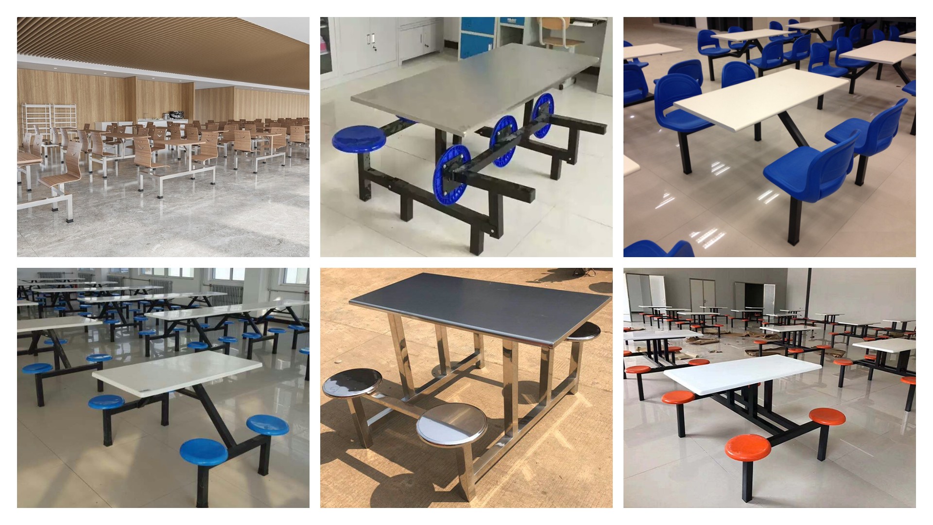 食堂餐桌用材比較廣泛,多以桌面與座椅相連接的款式為主。高度以720mm-760mm為標準,餐桌椅是人類日常生活和社會活動中使用的具有坐臥、憑倚、餐食等功能的器具。通常由若干個零、部件按一定接合方式裝配而成。給大家用餐時使用的桌椅,鋼木結構居多,結構簡單,顏色簡潔。   1、按設計方式不同分為:連體餐桌椅和分體餐桌椅。   2、按每個桌子設計的就餐人數的多少一般可分為:雙人位餐桌椅、四人位餐桌椅、六人位餐桌椅、八人位餐桌椅、十人位餐桌椅。   3、按餐桌椅材質的不同分為:鋼制餐桌椅(一般分為玻璃鋼、不銹鋼兩種)、木制餐桌椅(一般有實木餐桌椅、曲目餐桌椅等)、大理石餐桌椅、塑料餐桌椅。   4、按椅子的設計方式不同可分為:可折疊的,不可折疊的;圓凳的,帶靠背。